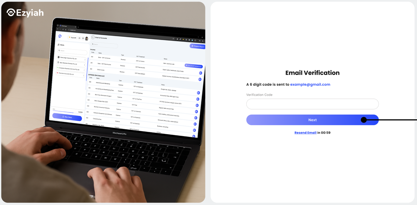 To protect your firm's data, Ezyiah requires email verification. A 6-digit security code will be sent to your inbox. Enter this code to proceed with your registration.
