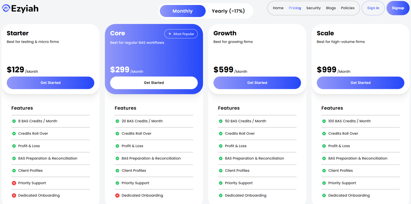 Core ($299/mo): Our most popular plan, designed for mid-sized firms with up to 50 entities and priority support.