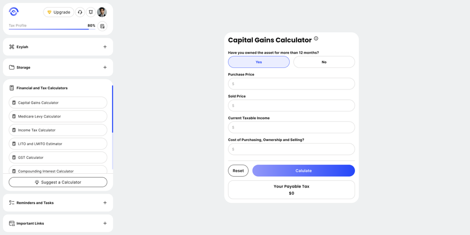 Eziyah provides built-in financial and tax calculators, including capital gains, medicare levy and income tax calculators. Here's a brief guide on how to use them: