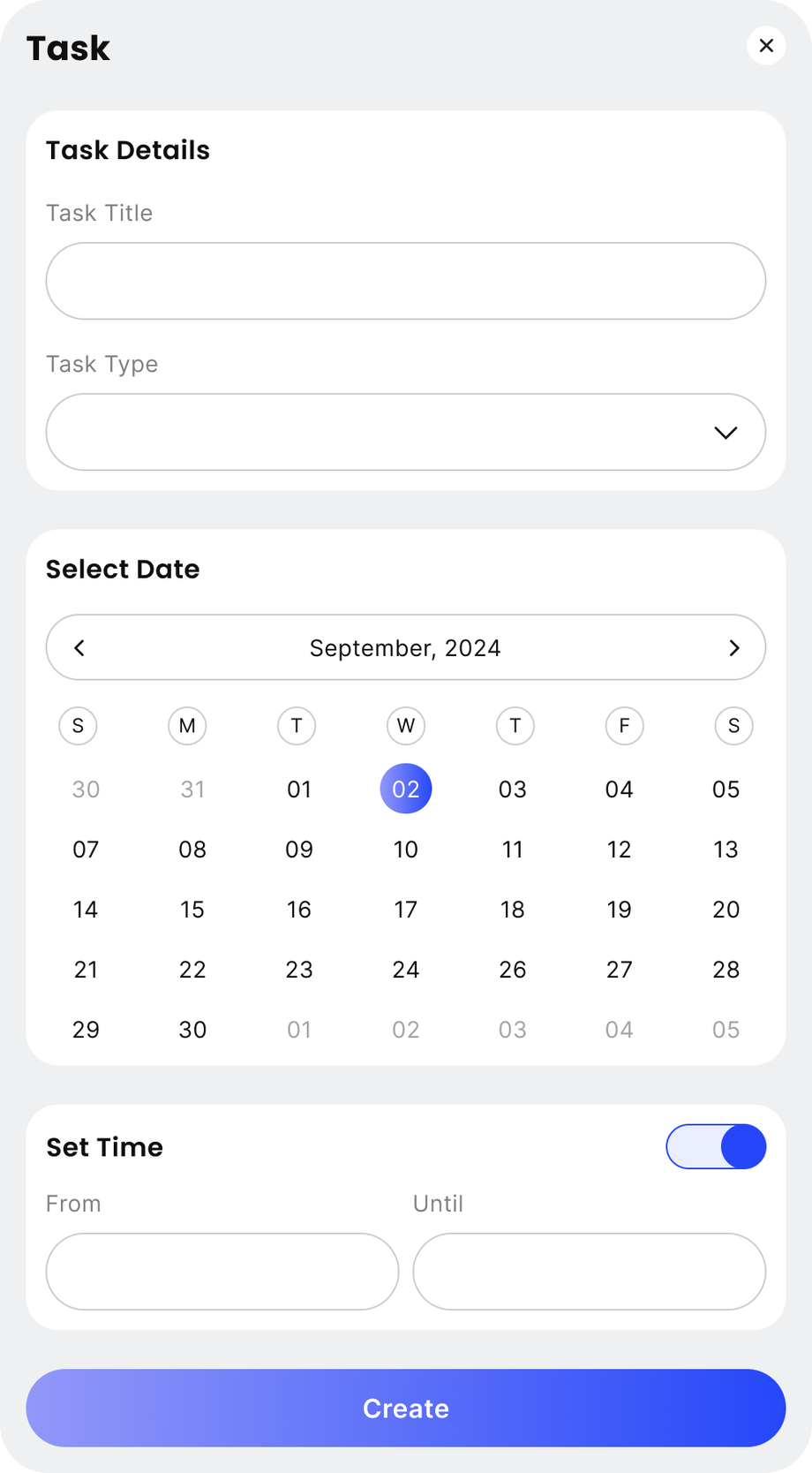 Click on the '+ Task' Button which will prompt you with a popup with several options relating to your task including the title, description, date and time.
