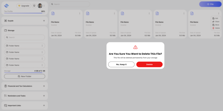 Deleting files Deleting your files is simple, just follow these steps: Go into your storage section in the Eziyah Dashboard. Choose a file and click the menu icon (3 Dots) and press on the 'Delete' Button. Afterwards, you'll be prompted with a popup asking for confirmation to have the file deleted.