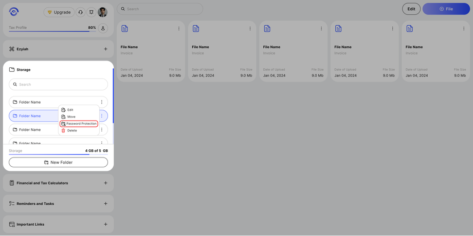 - In the storage section within the sidebar of your Eziyah Dashboard, click on the menu icon (3 Dots) and click the 'Password Protection' Button.