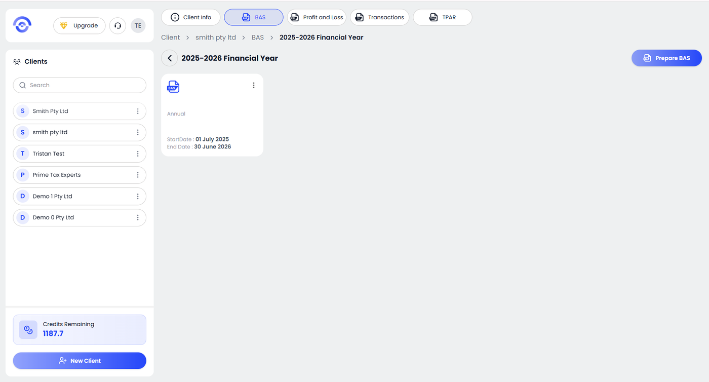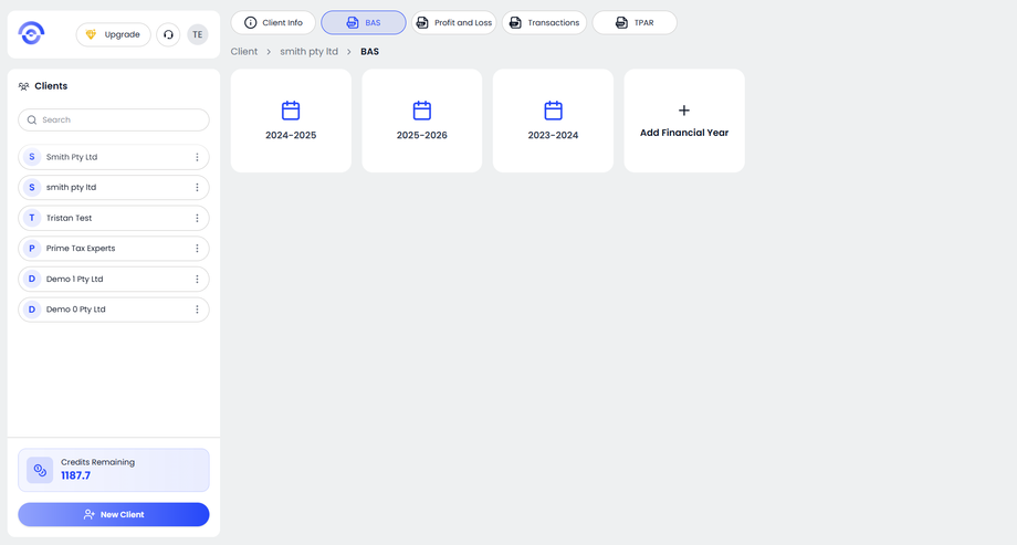 From the top navigation bar, click BAS. You will see the available financial years displayed as cards. Select the relevant financial year you want to prepare the BAS for. If the required financial year is not listed, click Add Financial Year and create it before proceeding.