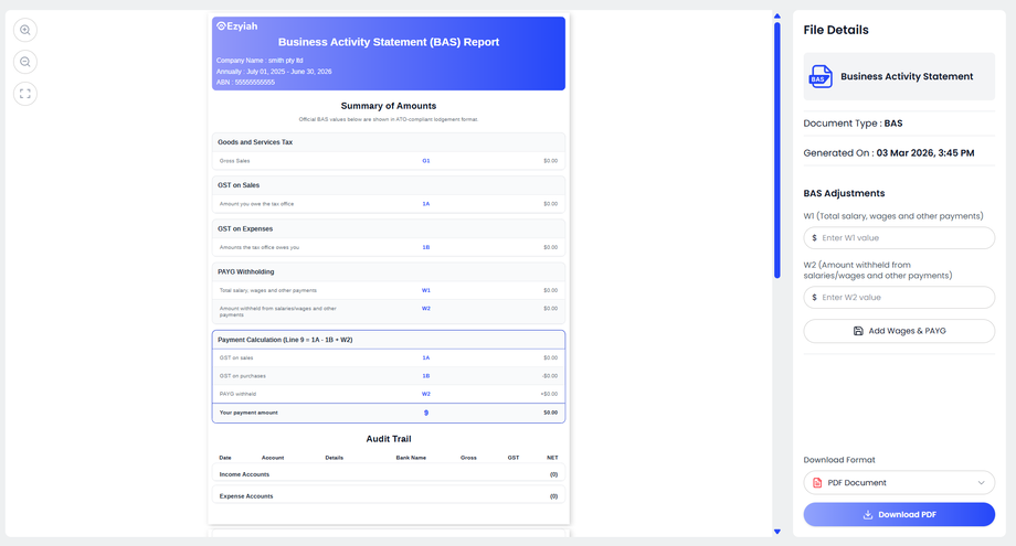 Click Add. The system will then generate and open the BAS report for the selected period.