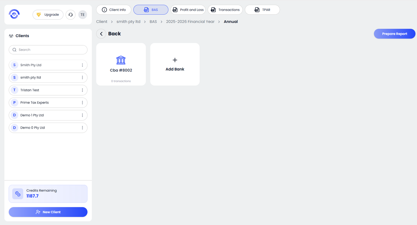After opening the selected BAS period, review the available bank accounts. In the top right corner, click Prepare Report.