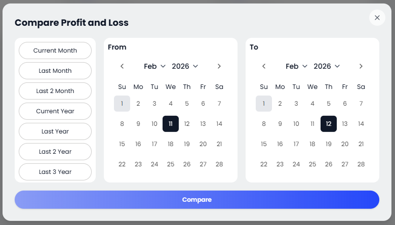 Current Year: Displays the P&L for the ongoing financial year (YTD).
