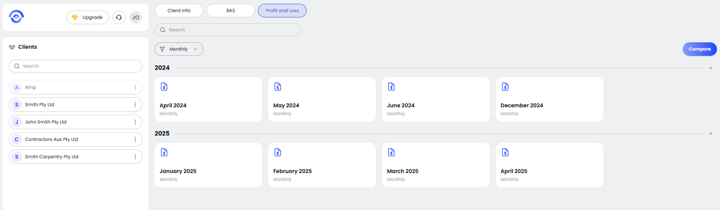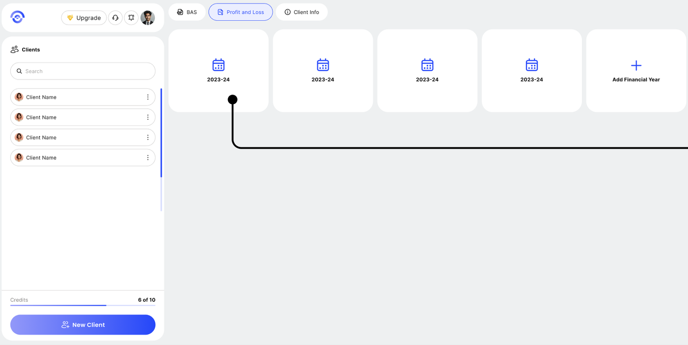 From the client’s main navigation header, click on the Profit and Loss tab. This view is dedicated to summarizing income and expenses without the tax-heavy focus of the BAS view.