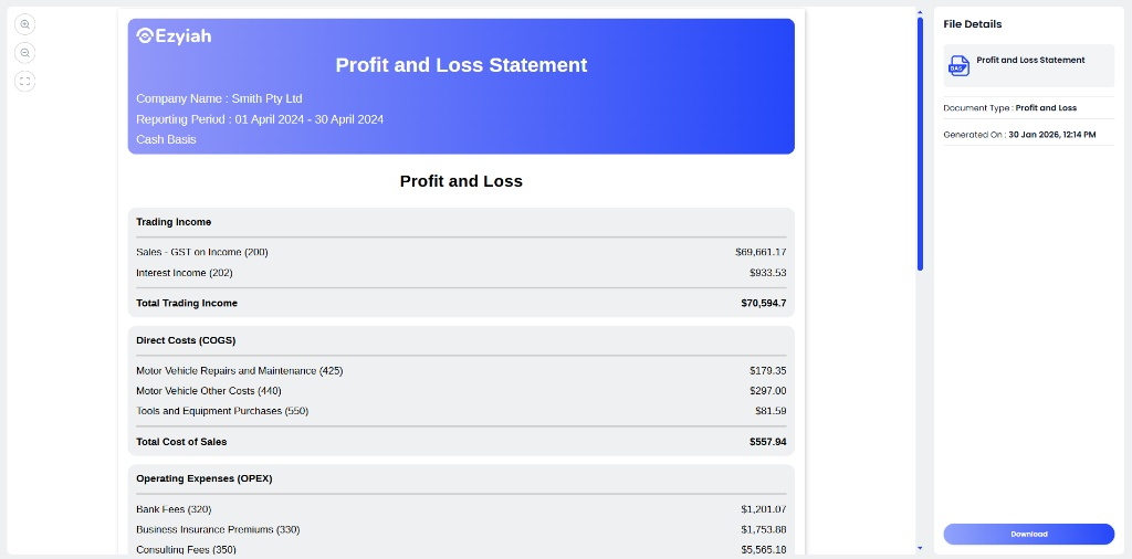 Once reconciliation is finalised, Ezyiah synthesises the data into a clean Profit and Loss Statement.