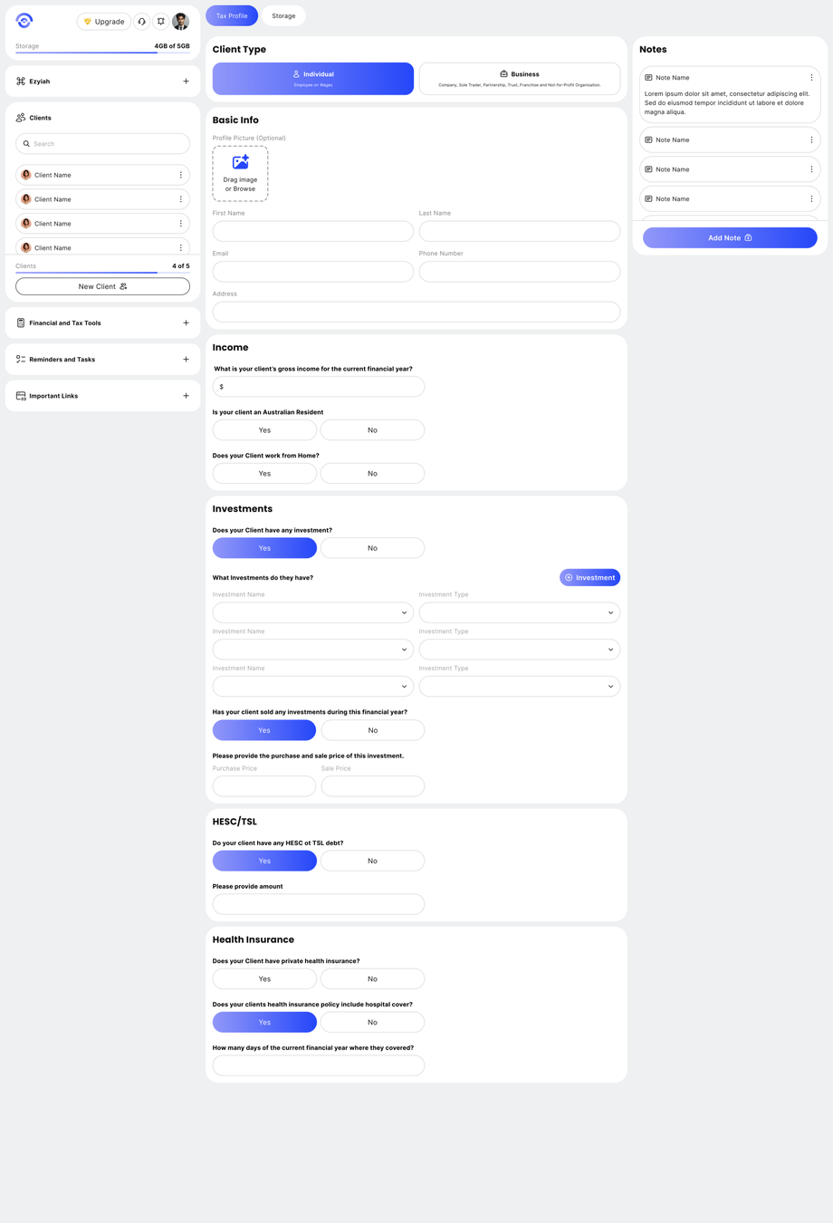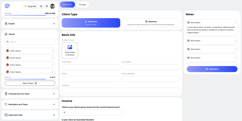 - Once the client is added, the screen below will appear where you can add client details such as the income and investments.