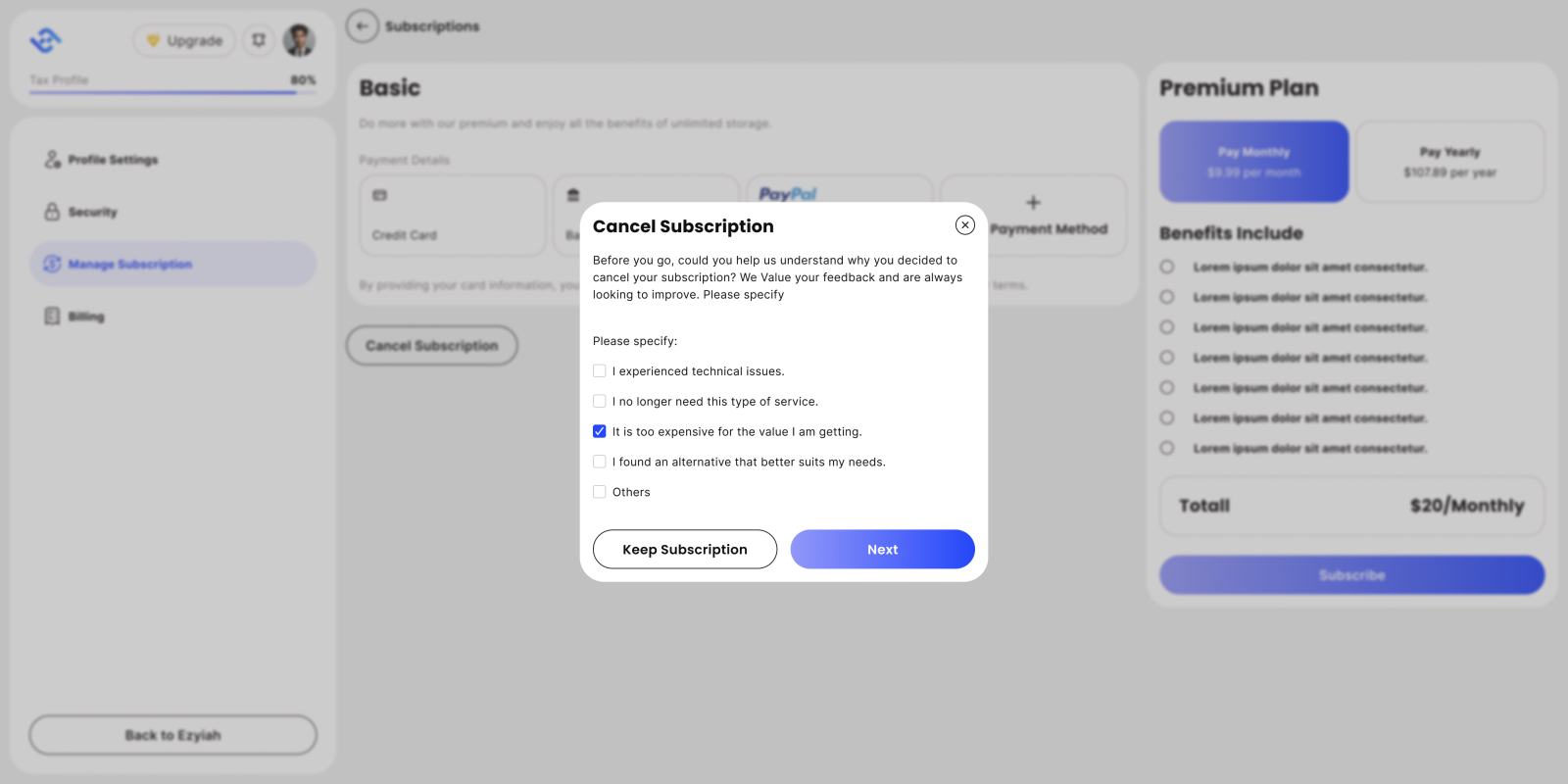 5. Upon clicking it, you'll get an alert asking you for a reason you'd like to cancel your subscription, select a reason and hit the 'Next' Button.