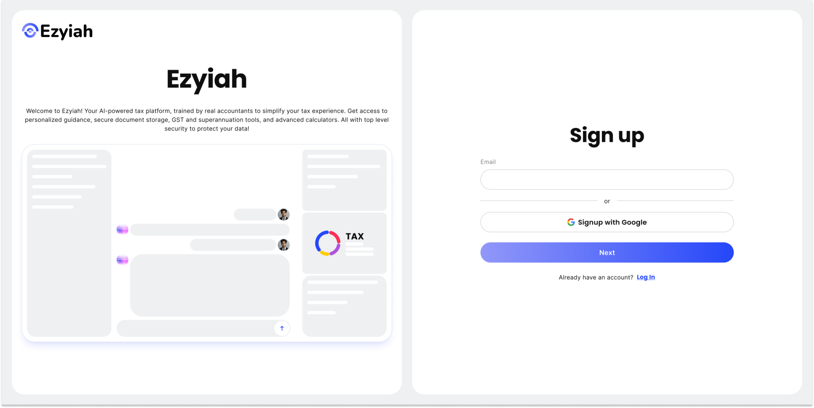 - Visit the Eziyah sign up page and sign up using your email address or with Google.