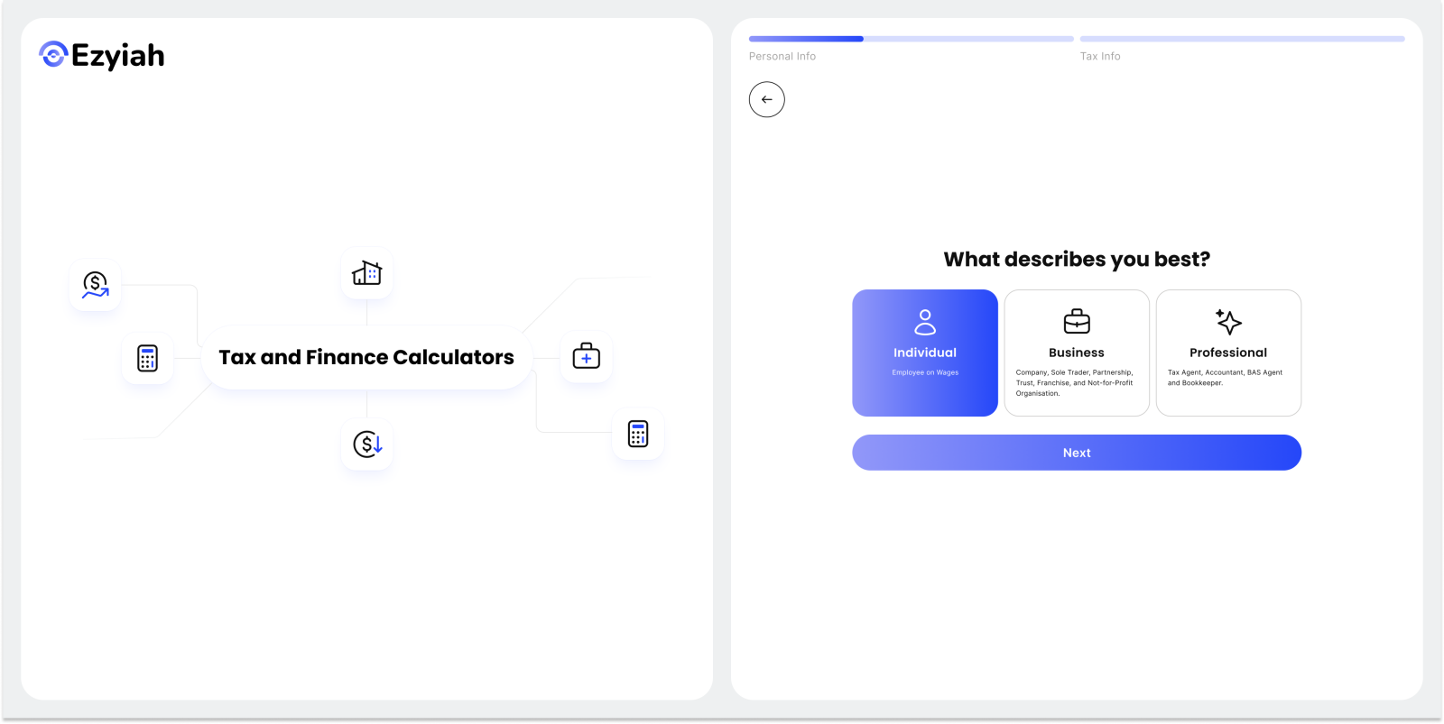 - You'll be asked to choose what you are including an individual, business or tax professional. Pick the option which best describes you and click 'Next'.