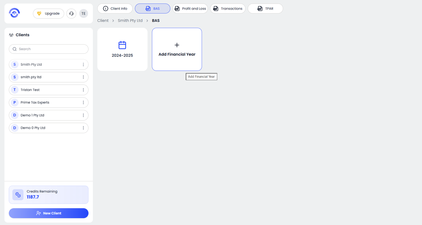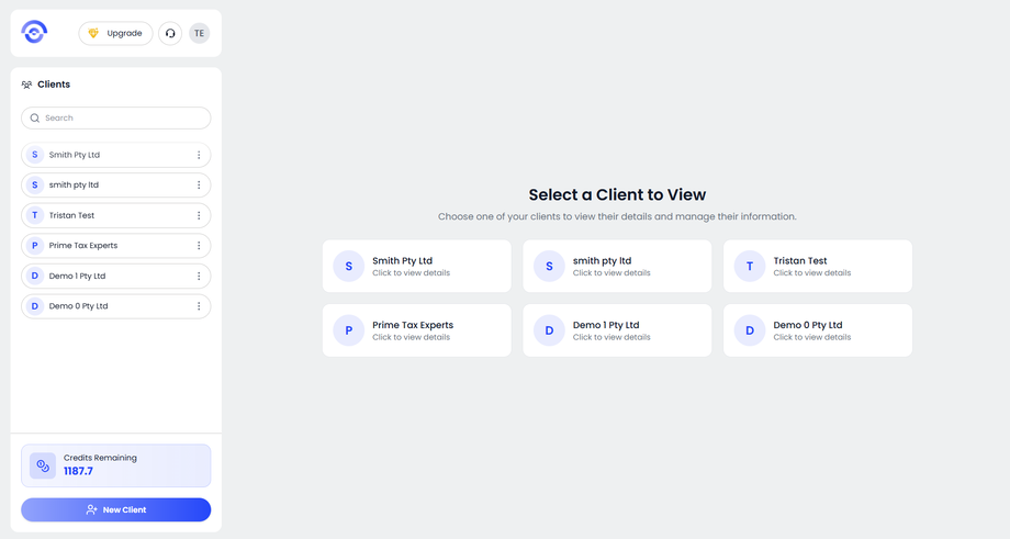 From the main dashboard, you will see the Select a Client to View screen. Choose the client you want to manage by clicking on their card. You can also select the client from the sidebar list. Once selected, you will be taken to the client workspace.