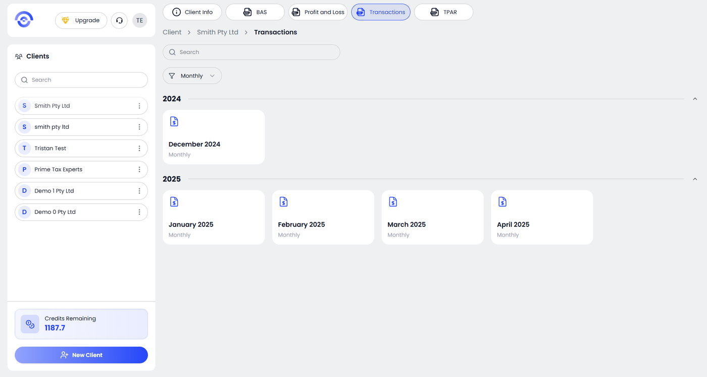 The Transactions module allows you to view and generate reports for financial activity. Select your client from the sidebar.