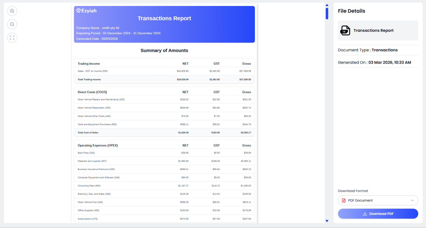 Under Download Format, select the required format. Click Download PDF to save the report. The Transactions Report is now ready for record keeping or sharing.